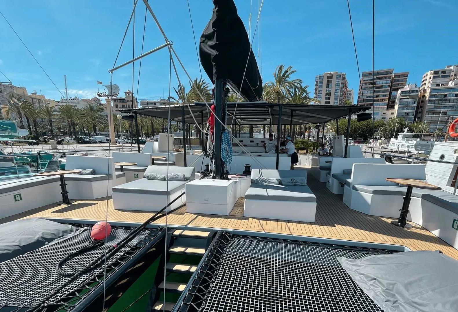 Enjoy our beautiful and luxurious catamaran, brand new in 2023 . This magnificent boat has a capacity of 84 people, but to make your experience super comfortable, we sail with a maximum of 55 people on board.