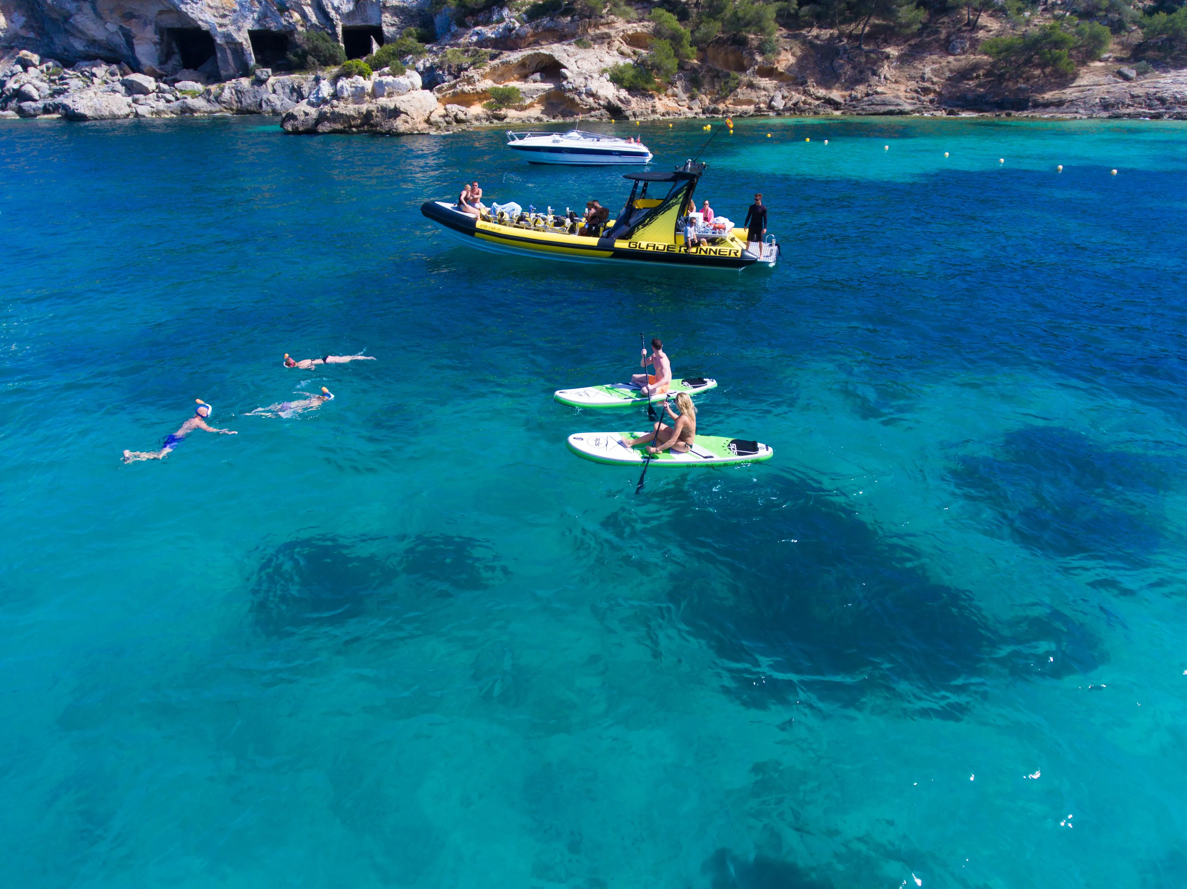 First of all, we will pick you up at the Magaluf beach pier. The first 35 minutes we will take you 15 km along the coast, visiting beautiful places and stopping at caves along the way. Then we headed to a beautiful cove with three beaches called Portals Vells, and we stopped there for 1h 15 min to enjoy activities that include: